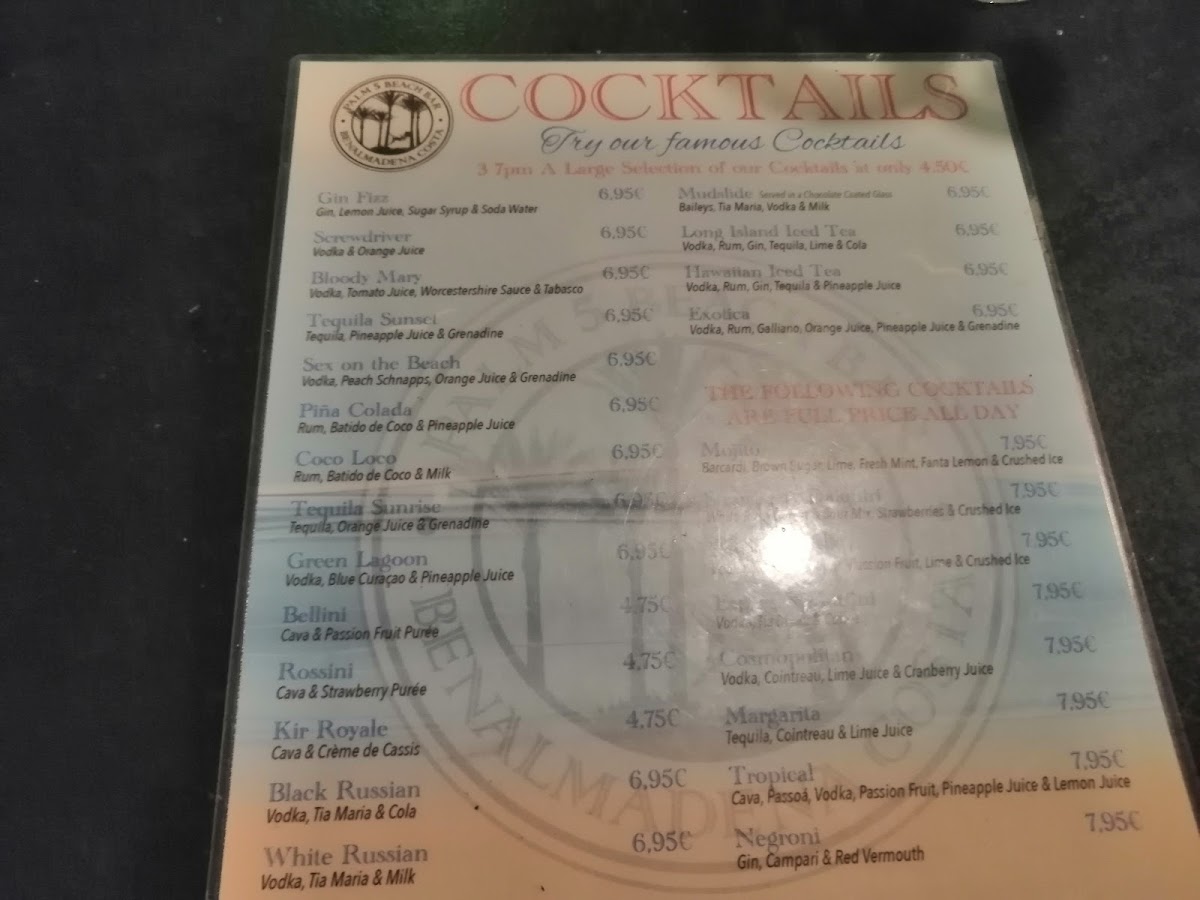 The menu at Palm 5 Beach Bar offers a selection of beverages and light food items suited for casual visits throughout the day. It primarily features a variety of alcoholic and non-alcoholic drinks, including classic and frozen cocktails such as Daquiri, Bloody Mary, Sangria, Pina Colada, Long Island Iced Tea, Mudslide, Black Russian, Mojito Sin Alcohol, and various other cocktail juices.