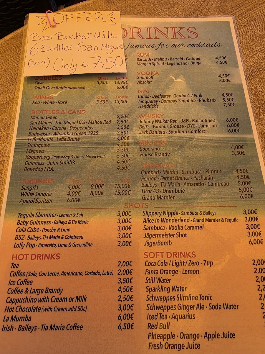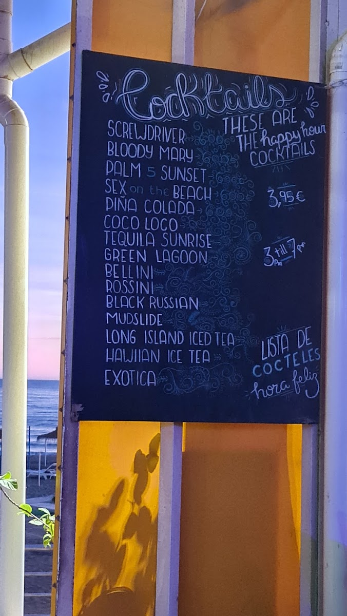 Beer is available chilled, complementing the beachfront setting. For those looking for light food options, the menu includes bar snacks and small dishes such as croquettes, Greek salad, pan ajo con queso, carrot cake, and brandy with coffee.